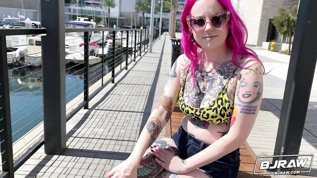 Description:I met the most interesting girl today. Her hair and her tattoos are what caught my eye, but she loved showing me her other body modifications. I had a feeling she would be down for showing me more, so I invited her over. I was right! She showed me what a good cocksucker she is and I showed her what her face looks like plastered in cum!