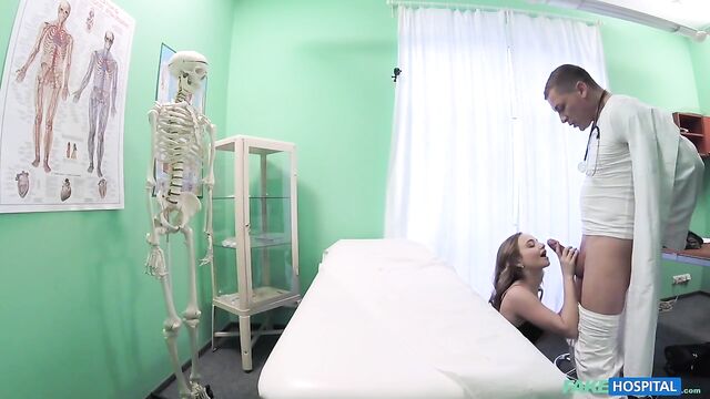 Description:It was Lady Bug's first appointment, and I had to leave her alone in my office to get a form for her to complete. I had told the pretty brunette about the cameras in the office, how we're recording for training for the local medical school. Perhaps she wasn't listening, because when I left the room, she started exploring: playing with equipment, and poking through things. She even started making sexual advances toward the full-sized skeleton we use for teaching! Of course, I didn't see all of this until later. I didn't know that she'd also found some love balls on my desk and had put them in her pussy during our consultation! When I found them during the exam, Lady Bug admitted her theft. To punish her, I rubbed her pussy to orgasm using her new toys. Lady Bug rewarded me by sucking my massive cock, then letting me fuck her on the exam table. She screamed so loud, I thought the neighbors might call the cops, but it was worth it to get the video. I told her I'd send her a copy.