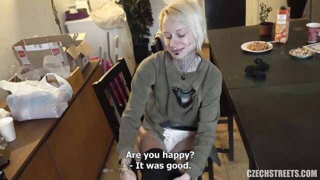 Description:Walking down the street these days and offering cash for sex is really hard. I tried it maybe 100 times before I managed to find girls which didn't run away or told me to fuck off. Step sisters Charlotte (18) and Teresa (20) are passionate fans of tattoos and piercings, and at first side it was clear that they were completely broke. I had to be like a lottery to them. They invited me to their house, where their mother cooked some left overs in the kitchen and she was completely ok that her daughters were banging my dick for cash. She even showed me her huge tits for 5K! Do you understand that?! I fuck Teresa's hairy pussy and her sister and mom watched it and cheered her up. Then I fuck Charlotte hard in her narrow 18-year-old pussy and finally cum into girls coffee cup. MRS mother said she likes milk in her coffee, oh my! Guys, that is an incredible visit! You can't stop Czech streets!