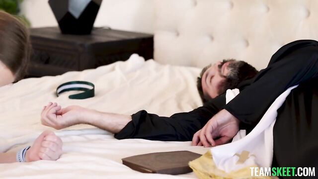 Description:Laney is a good Christian girl, but curiosity gets the better of her when she finds a weird book in the school’s library. She reads a few passages and an invisible dark force takes hold of her body and makes her so fucking horny she can’t help but pleasure herself. After furiously rubbing her pussy and making herself cum, she gets scared of these new feelings and calls Father Shar to help her. He comes with his colleague, Father Newman, and explains to her that the book she found is a very dangerous thing and she’s been possessed by a demon they need to get rid of. When all traditional methods fail and little Laney gets incredibly horny again, Father Newman will rise to the occasion and fuck the demon out of her! He eats her out but the demon is holding on to her strong, so he whips out his sanctified cock and pounds her little pussy up until he can neutralize that demon for good, planting the Lord’s seed deep inside her womb!