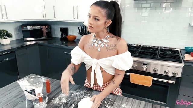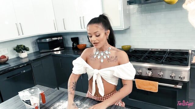 Description:Ryan Reid is trying to make a bread-baking tutorial for her fans, but her girlfriend Scarlett Alexis keeps distracting her! First Scarlett climbs up on the counter and shows Ryan her tits, then plays with her pussy. Ryan flings flour at her, but Scarlett has another trick up her sleeve. She crawls behind the counter and licks Ryan from behind! The vlogger tries to keep it together as she kneads the dough, but she gives in to lust as Scarlett fingers her. She puts her GF on the counter to eat her pussy, then sits on Scarlett's face, and the hungry hotties 69 and scissor so they can both get their fill.