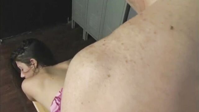 Description:Petite darling Jackie Ashe takes t-lickers average sized penis in her vagina. This sexy couple makes sweet sweet love in the locker room as the young ho worships the older gentleman. The gorgeous whore removes her dress to reveal her bald muff that is ready for loving. This teen brunette is a cutie pie that wants the faculty dick at her school. He munches her carpet and she enjoys it very much. She then wraps her gentle lips around his veiny cock to give me all that he wants. This sets up the special love making between the lovers which is hot and passionate.