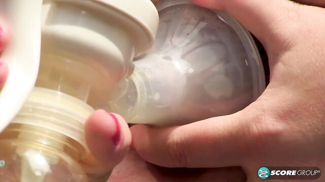 Description:Natalie, we can't take our eyes off of them. She peels off her top and pops her boobs out of her bra, revealing her already-erect nipples. Natalie pulls her right boob up to her mouth and begins teasing herself with her tongue. Natalie's tits have gotten bigger and heavier following her pregnancy. She pulls out a milk pump and coaxes some fresh milk out of her right mammary.