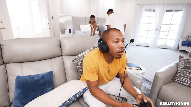 Description:Ryder Rey is horny, but her boyfriend Ricky Johnson has been gaming for hours and shows no sign of stopping! Ricky won't press her buttons, so Ryder turns her attention to player two, Air Thugger, who's more than happy to have the little hottie take out his joystick. Ricky doesn't notice a thing when his gf takes his buddy to the bed and gets her pussy eaten, then slobbers all over Air's cock right behind his back. With his headphones on, he doesn't even hear Ryder's moans as she gets her pussy pounded nice and deep by that big dick!