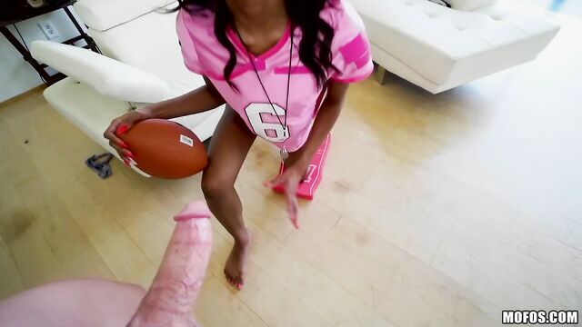 Description:This ebony babe Nia Nacci was riding high from her fantasy football win, but it was her bf who got the real spoils of victory when she took out her big tits, gave him a blowjob, and then took his big cock deep inside her pink pussy!