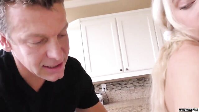 Descripción: Sexy blonde babysitter is talking with the client in his kitchen. This leads to them kissing and him touching her body. She bends over with her skirt raised and he eats her pussy from behind. After this he pulls out his big dick and pushes it into her hot hole. She takes him deep and hard over the counter. Then he pulls it out and lets her suck his hard cock. She sucks him good until she lets him back inside of her hole with her legs spread wide. They get into several positions with her finally climbing on to him to ride his dick to get him to blow his load.